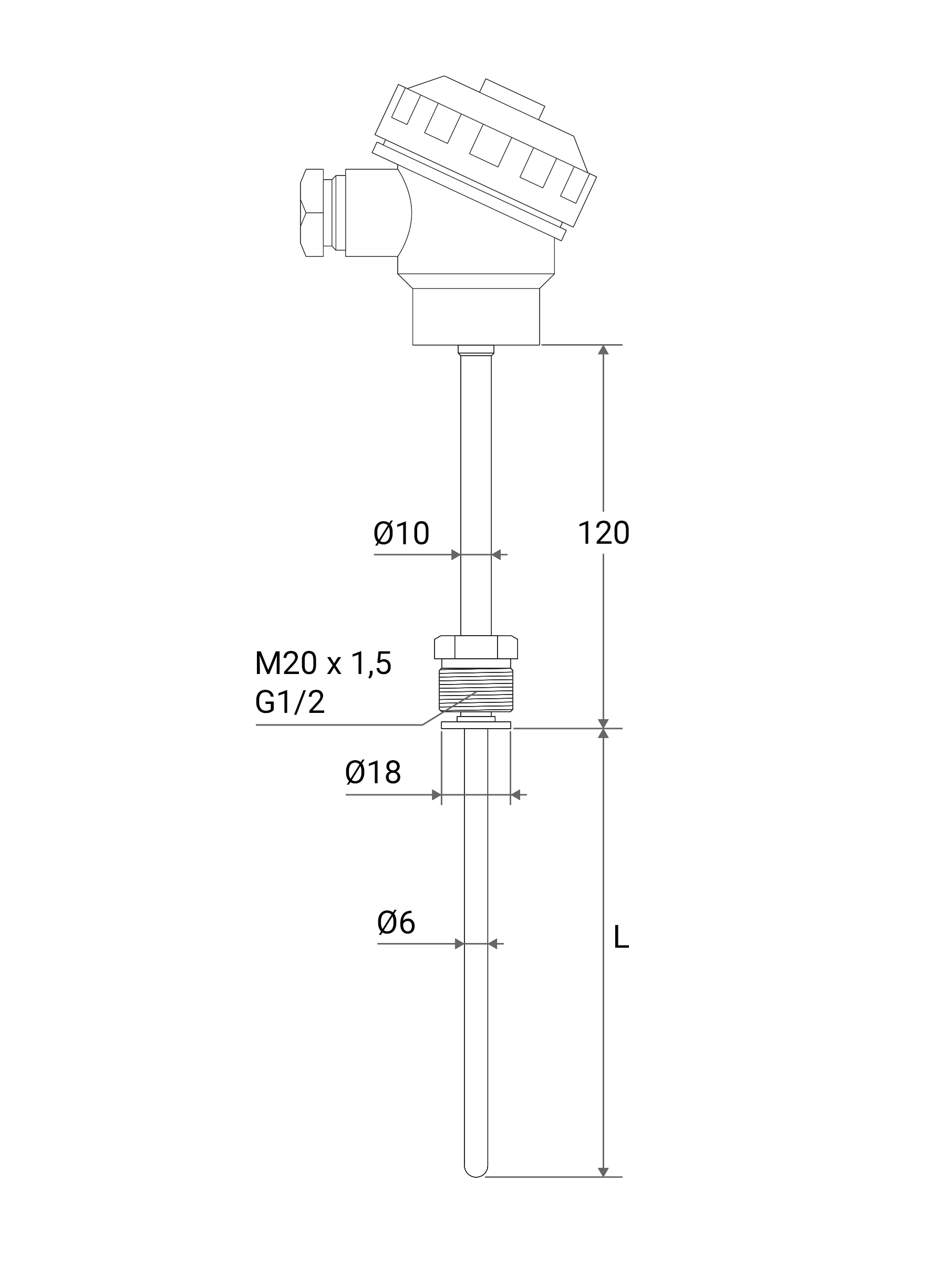 The thermocouple model is made of the MI cable and an industrial head. The probe consists a free M20x1.5 hex fitting to mount. It applies to measure temperature of gas-like and air environments. It's recommended to order the 4-20 mA / RS485 transducer (T-bus/ModBus protocol) in the remote Z67 enclosure with a cable gland and connect it by the compensating cable to avoid overheating.