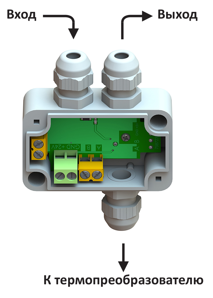 2-17 temperature transducer uses RS485 interface for data transfer. That interface allows to connect consequently up to 30 probes on a single cable line. The transducer connects to the RS485 net by the 5 wired scheme.