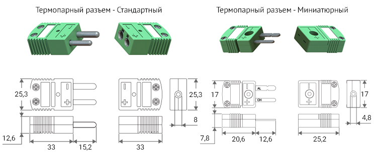 Применяются для подключения термопарных и термокомпенсационных кабелей. Контакты разъемов выполнены из соответствующих термопарных сплавов, благодаря чему в измерительную цепь не вносится дополнительных температурных погрешностей.