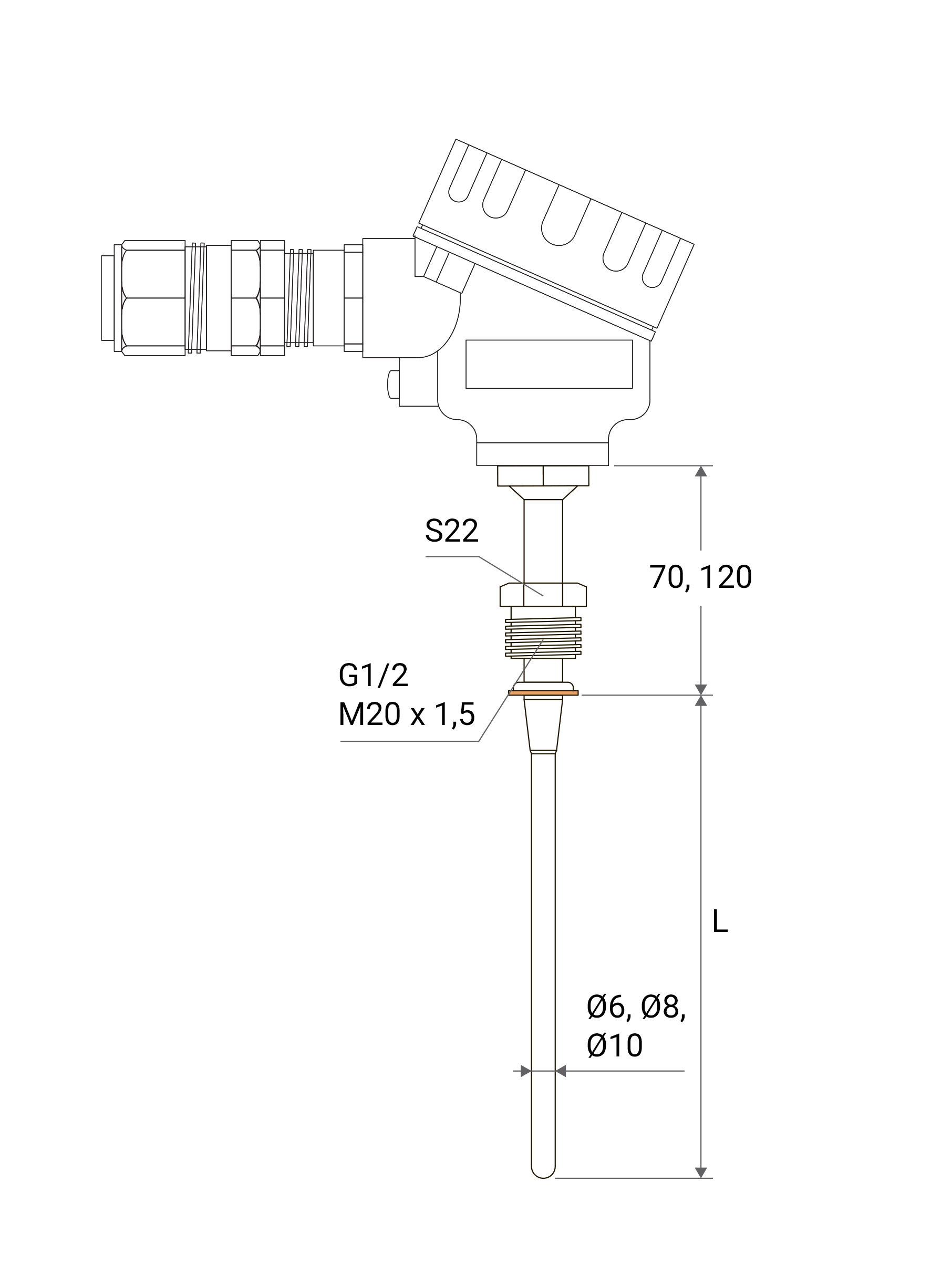 Один з найпоширеніших конструктивів датчиків температури з рухомим штуцером і клемною головкою. Виконання "вибухонепроникна оболонка" Exd або "іскробезпечний ланцюг" Exia. Застосовується для вимірювання температури у вибухонебезпечних середовищах. Може постачатися у комплекті з зовнішньою гільзою і бобишкою. В клемну головку може вбудовуватися перетворювач сигналу в 4-20 мА або 4-20 мА з протоколом HART.