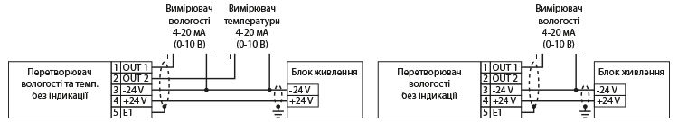 Перетворювач відносної вологості і температури 08 використовує аналоговий інтерфейс 4-20 мА (0-10 V) для передачі даних. В залежності від конфігурації каналів вимірювання датчик підключається до лінії 4-20 мА (0-10 V) по 4-х, 3-х або 2-х дротовій схемі з живленням від зовнішнього блоку живлення. Для прокладки лінії використовується екранований кабель "кручена пара" або дві "кручені пари" в залежності від кількості каналів вимірювання датчика. Підключення до лінії 4-20 мА (0-10 V) здійснюється через гвинтові клеми всередині перетворювача.
